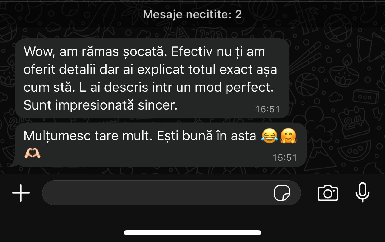 După confirmarea plății, vei primi un mail unde va fi atașat numărul meu de telefon. Imi poți scrie pe whatsapp.